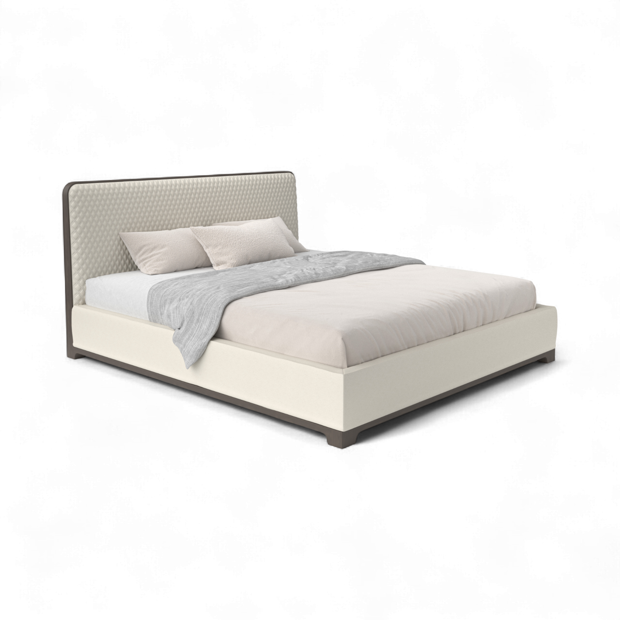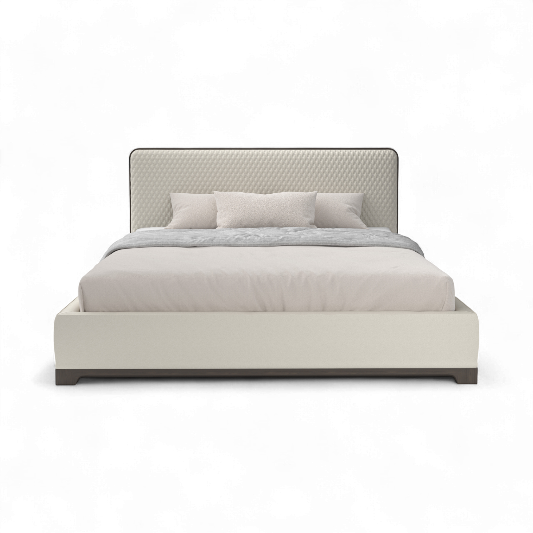 Return to the place you came from to find the warmth of your own home and the security of your own things. The bed welcomes the travelling artist in between its enveloping lines, with the padded headboard and the precious finishing touches. The large padded headboard is embellished with refined quilted workmanship and framed by beautiful wood. The bed has a striking presence but becomes part of the environment with extreme gracefulness. The bed comes in several sizes and is available in versions with base with storage compartment, handy for storing pillows, blankets and bed linens. Aesthetic details: the wide and comfortable headboard is embellished with a delicate leather work, with diamond-shaped stitching, slightly domed. An exclusive Alivar design. Mattress not included in the price.