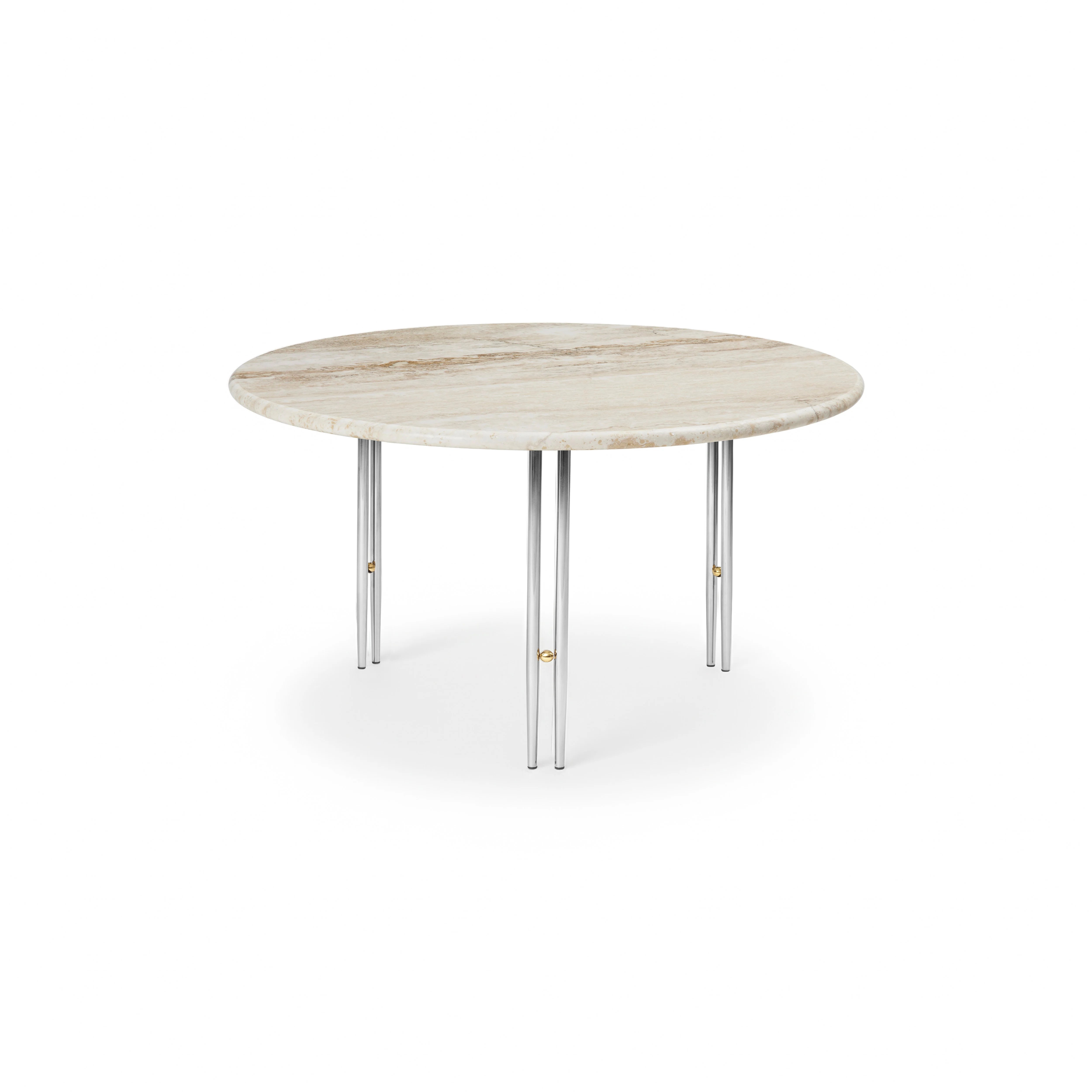 The IOI Coffee Tables by GamFratesi are a celebration of Italian materiality, featuring solid brass, steel, and now travertine. Drawing on geometric Art Deco references with a contemporary design language, the collection explores the empty space between the physical form as much as the form itself. Striking and unique, the IOI Collection takes its name from the structure of the table legs, each of which is formed from twin metal tubes linked by a sphere of brass the letters I-O-I rendered in physical form. Retaining this slender base, in black or chrome options, GUBI’s new edition introduces a new material and color to the circular tabletop travertine in Rippled Beige and refines its shape. The sides are rounded to create a U-shaped edge that arcs evenly on the top and bottom. At two different heights and diameters, the IOI Coffee Tables work well in pairs, groups and even clusters or alone as a single table alongside GUBI’s extensive range of lounge chairs and sofas.