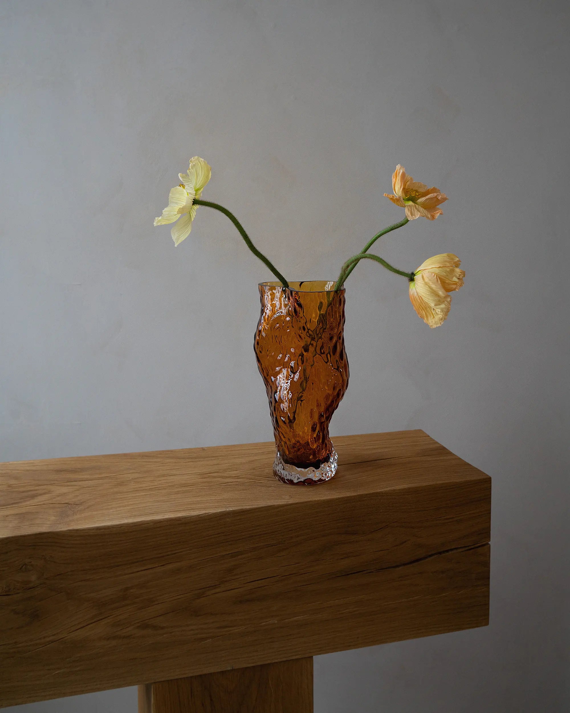 The Ostrea Vase is inspired by Infinite treasures of the sea - light reflections of rock and oyster formations - transformed to a organic collection of small objects - created to beautify, ease and calm everyday living. Ostrea Collection was drawn at the westcoast in 2015, every vase is mouth blown, the mould is carved by hand creating the unique raw surface and colors.