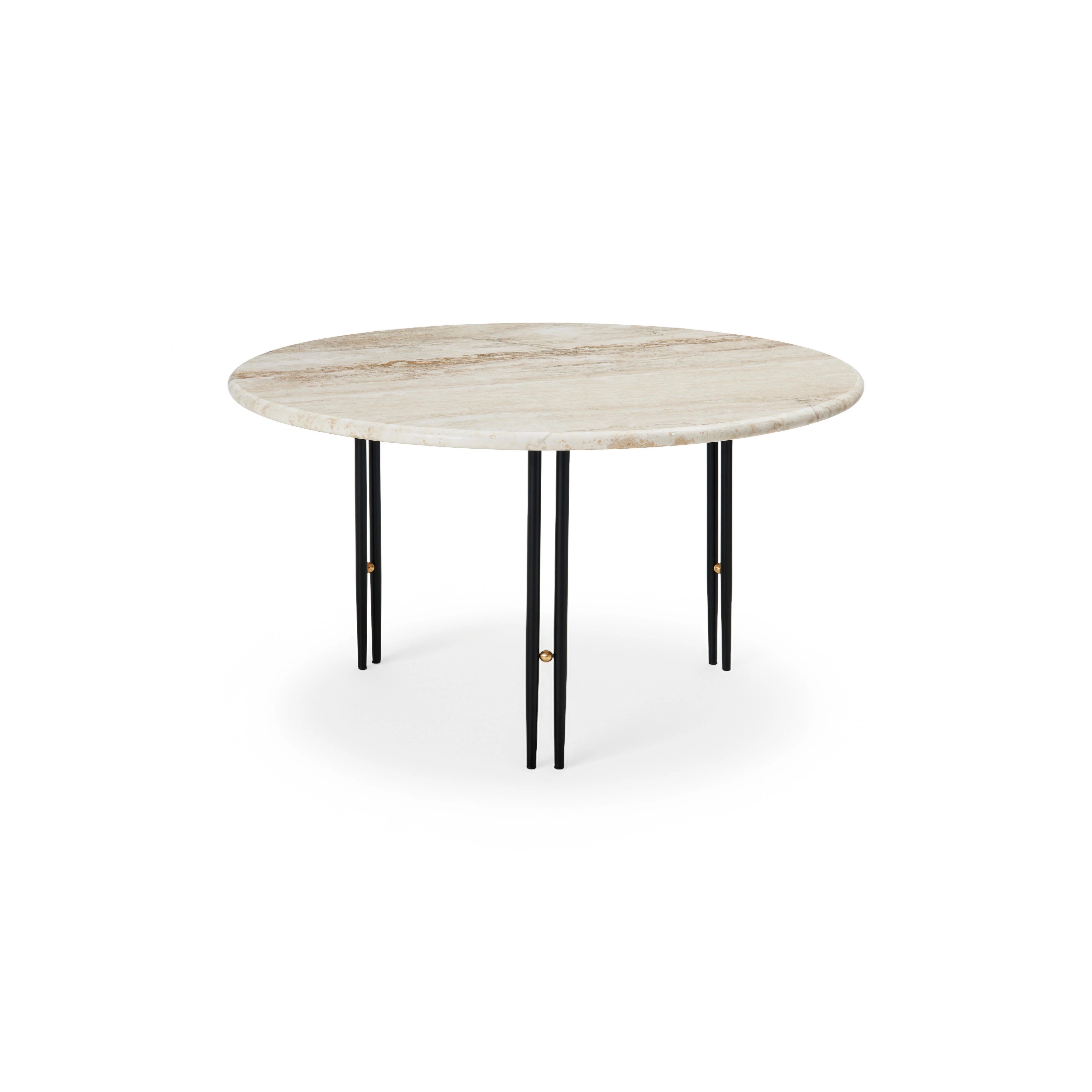 The IOI Coffee Tables by GamFratesi are a celebration of Italian materiality, featuring solid brass, steel, and now travertine. Drawing on geometric Art Deco references with a contemporary design language, the collection explores the empty space between the physical form as much as the form itself. Striking and unique, the IOI Collection takes its name from the structure of the table legs, each of which is formed from twin metal tubes linked by a sphere of brass the letters I-O-I rendered in physical form. Retaining this slender base, in black or chrome options, GUBI’s new edition introduces a new material and color to the circular tabletop travertine in Rippled Beige and refines its shape. The sides are rounded to create a U-shaped edge that arcs evenly on the top and bottom. At two different heights and diameters, the IOI Coffee Tables work well in pairs, groups and even clusters or alone as a single table alongside GUBI’s extensive range of lounge chairs and sofas.