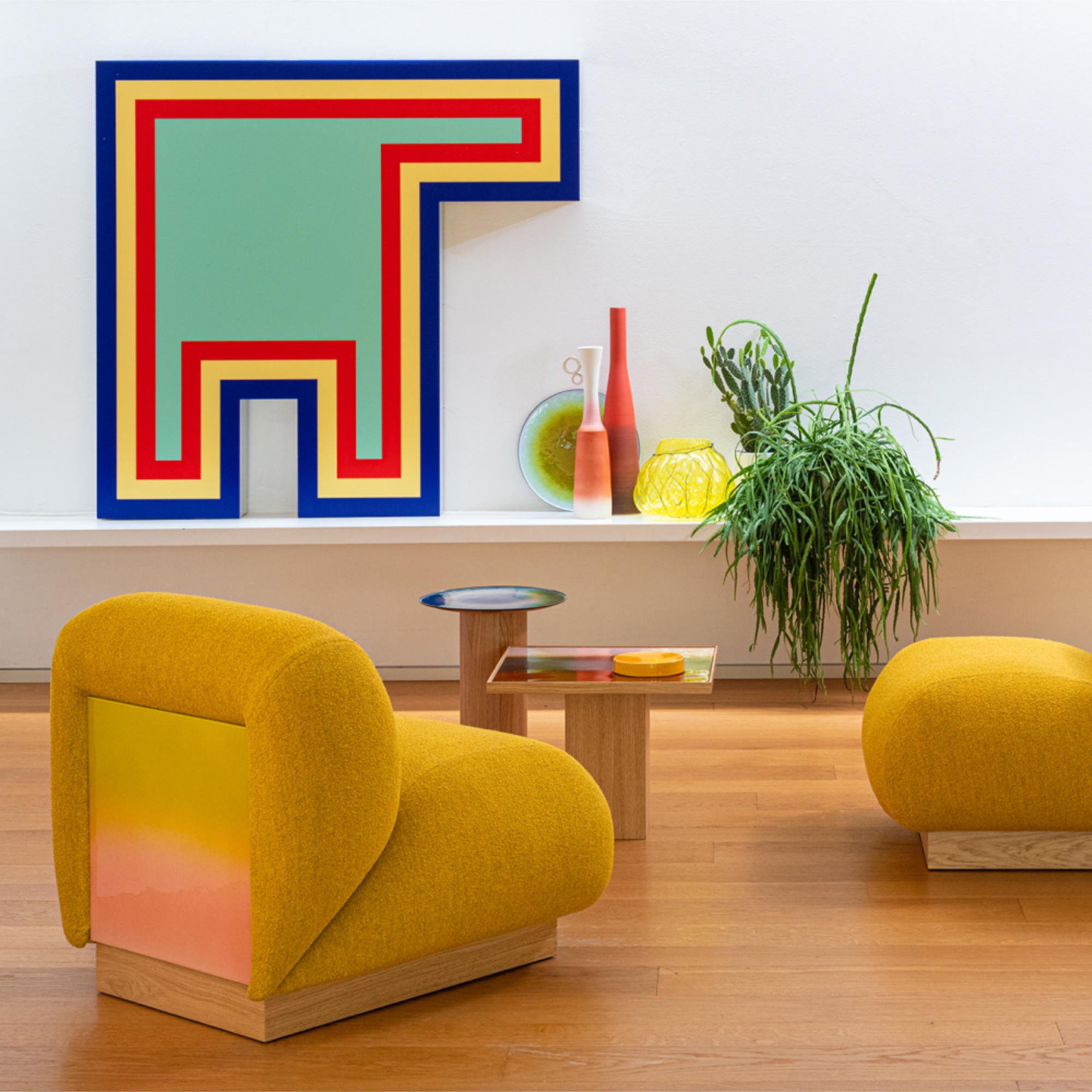 The soft and enveloping lines of Clay combine with a unique element: a handcrafted ceramic panel that acts as a backrest, transforming the seat into a real functional sculpture . Each piece is handmade in the historic ceramic district of Nove (Vicenza), with two- and three-dimensional sheets decorated with precious enamels and lustres , enhancing the uniqueness of each creation.