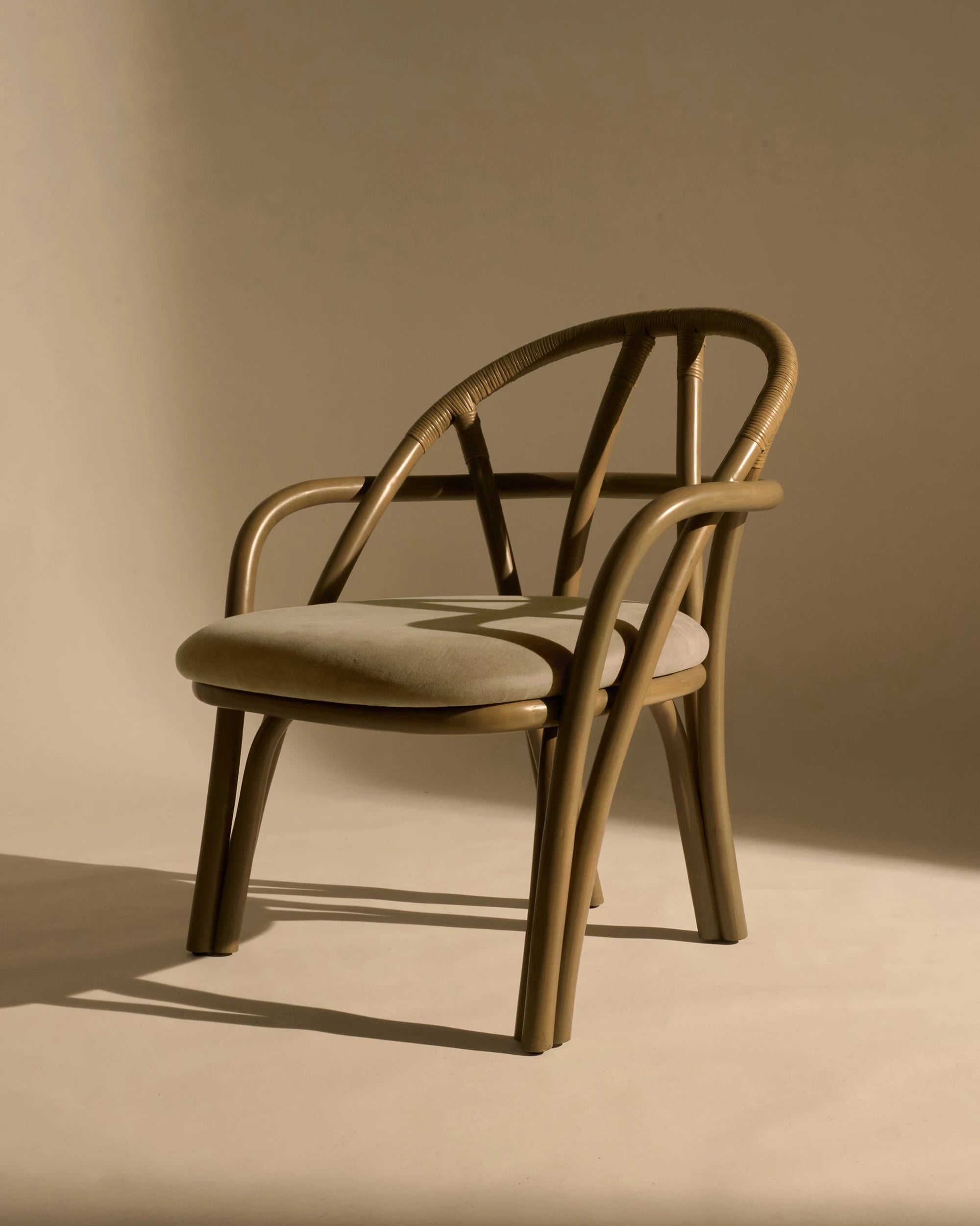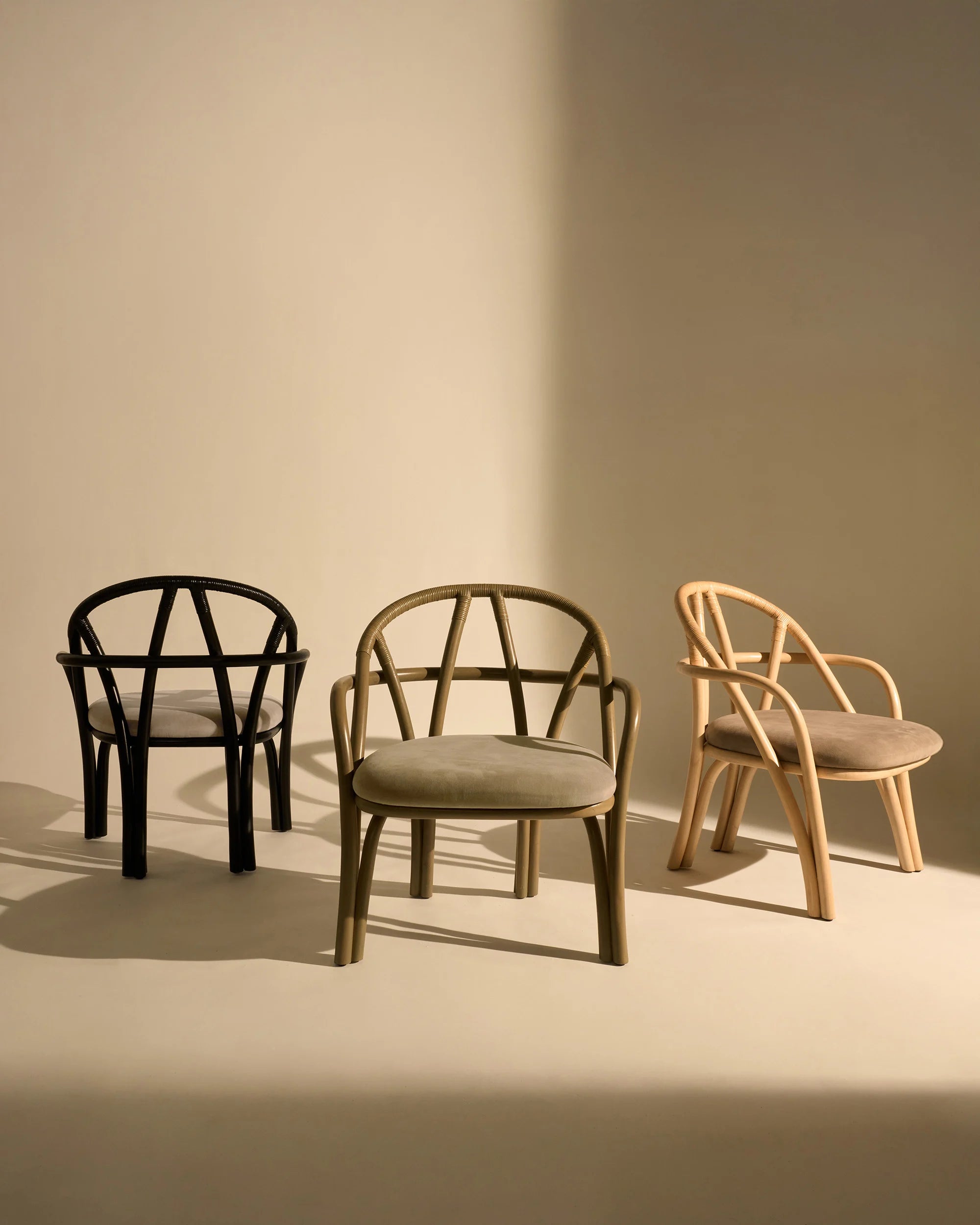 "Designed for GUBI by Michele De Lucchi’s AMDL Circle, Bistra is a sculptural furniture collection that distills the classic bistro chair to its essential form, finding elegance and timelessness in its core structural elements. Comprising a dining armchair, a lounge chair, and a three-legged stool, the collection is rooted in its principal material: steam-bent rattan. Its visual language draws from the idea of organic growth, expressed in the tree-like contours of the legs, arms, and backrest, and echoed in the custom-designed upholstery, which features a botanical motif inspired by a Leonardo da Vinci fresco. Available in three frame colors and multiple upholstery fabrics, Bistra is a versatile seating collection that blends artisanal furniture-making traditions with exquisite contemporary craftsmanship."