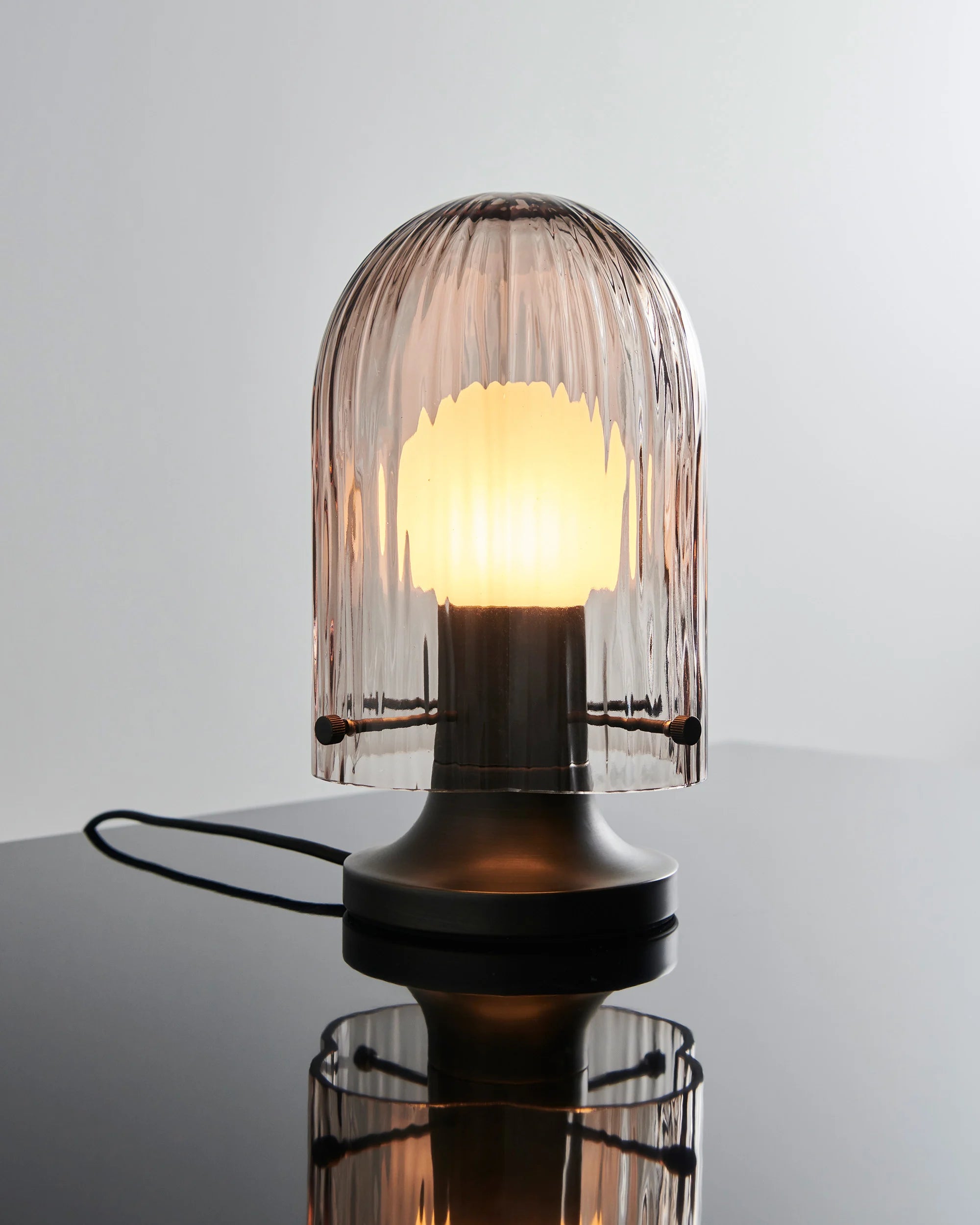 The Seine Collection by Space Copenhagen was inspired by the behavior of light in moving water, an effect that was captured through the use of patterned mouth-blown glass. The collection comprises of a Table Lamp, Ceiling Lamp, and Pendant, each of can be configured with a shade in Smoke, a lightly tinted translucent glass which reveals the in- ner structure of the lamp, or Coral, where the interior of the shade has been sand-blasted to create a clouded effect. Each Seine lamp draws on the power of glass to soften, layer, and blur light, creating a dreamy a reflective ambiance.